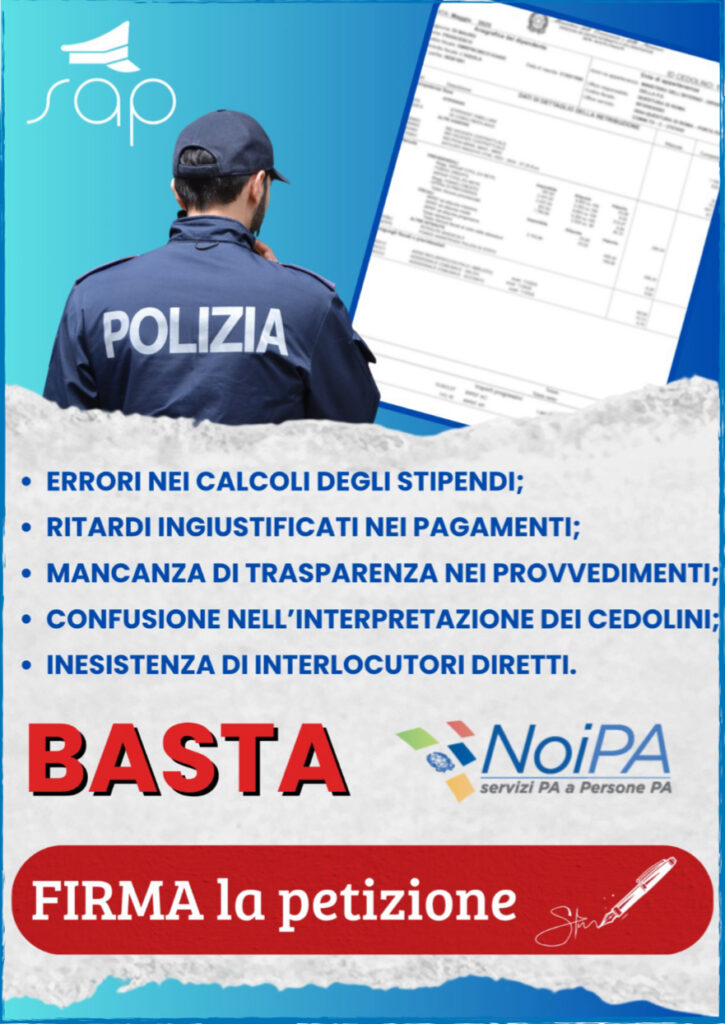 Il Sindacato Autonomo di Polizia (SAP) ha deciso di dire basta a NoiPA. Dopo anni di disservizi, errori e mancanza di trasparenza nella gestione degli stipendi del personale in divisa, il SAP lancia una petizione nazionale per chiedere l’uscita dal sistema NoiPA e tornare a una gestione diretta delle buste paga.
