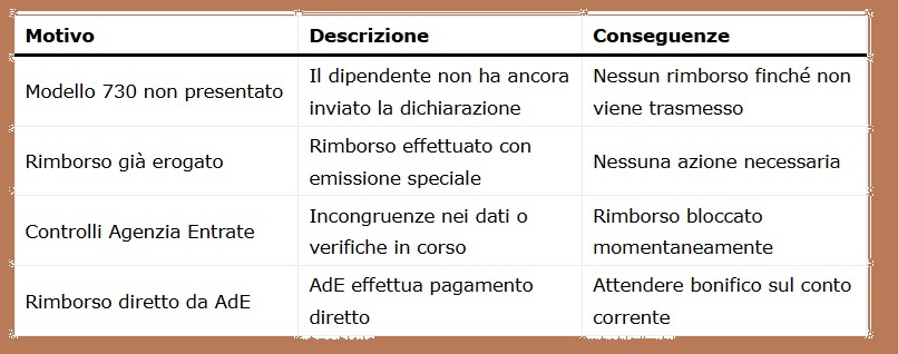 Con l’arrivo del cedolino di luglio, molti dipendenti pubblici si aspettano di vedere il rimborso del modello 730 accreditato direttamente in busta paga. Tuttavia, capita spesso che il rimborso atteso non compaia nel cedolino. Non si tratta sempre di un errore o ritardo da parte di NoiPA: ci sono diverse ragioni, più comuni di quanto si pensi, che giustificano questo scenario.