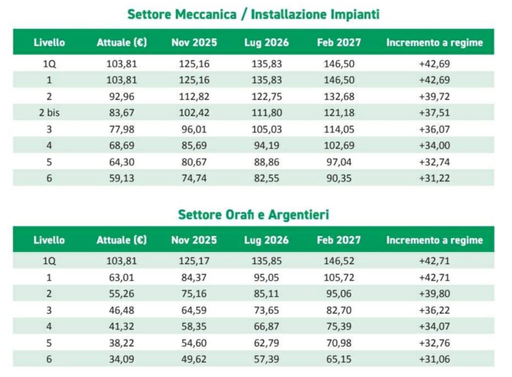 Gli incrementi variano in base ai livelli e ai settori. Nel comparto meccanica e installazione impianti, il livello 1Q passa da 103,81 euro a 146,50 euro (+42,69 €), mentre il livello 6 sale da 59,13 euro a 90,35 euro (+31,22 €).