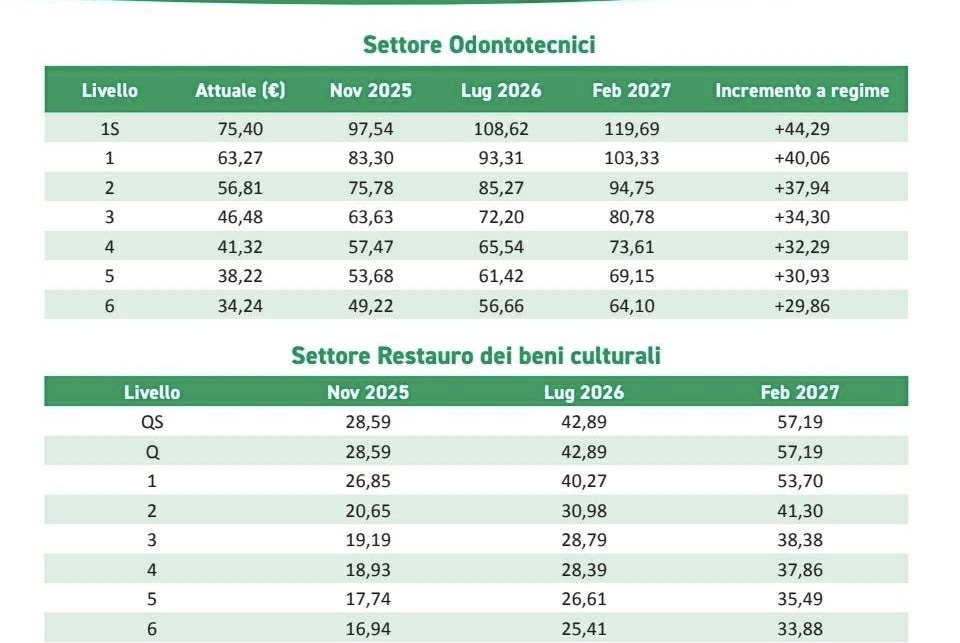 Per gli orafi e argentieri, l’incremento massimo è di oltre 42 euro, mentre negli odontotecnici il livello più alto cresce di 44,29 euro. Per il restauro dei beni culturali, l’aumento tocca quasi 28 euro.