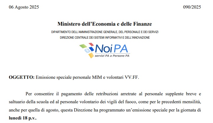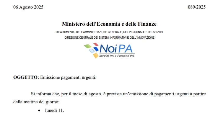 Con il messaggio n. 089, NoiPA ha annunciato l’emissione urgente di lunedì 11 gennaio: