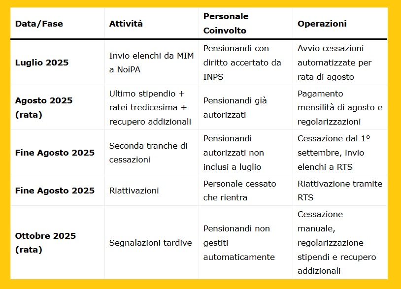 L’obiettivo è duplice: da un lato garantire la correttezza dei pagamenti per il personale in uscita, dall’altro evitare doppi accrediti o ritardi nelle operazioni di cessazione.