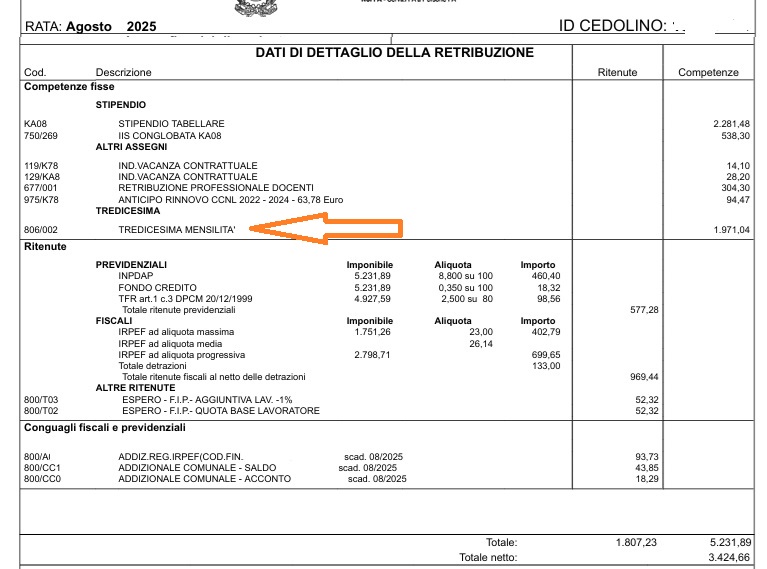Come possiamo vedere, indicato dalla freccia rossa, sono presenti gli otto dodicesimi di tredicesima mensilità 2025 maturati fino alla data di pensionamento. Gli altri quattro dodicesimi saranno liquidati il 1° dicembre insieme alla pensione.