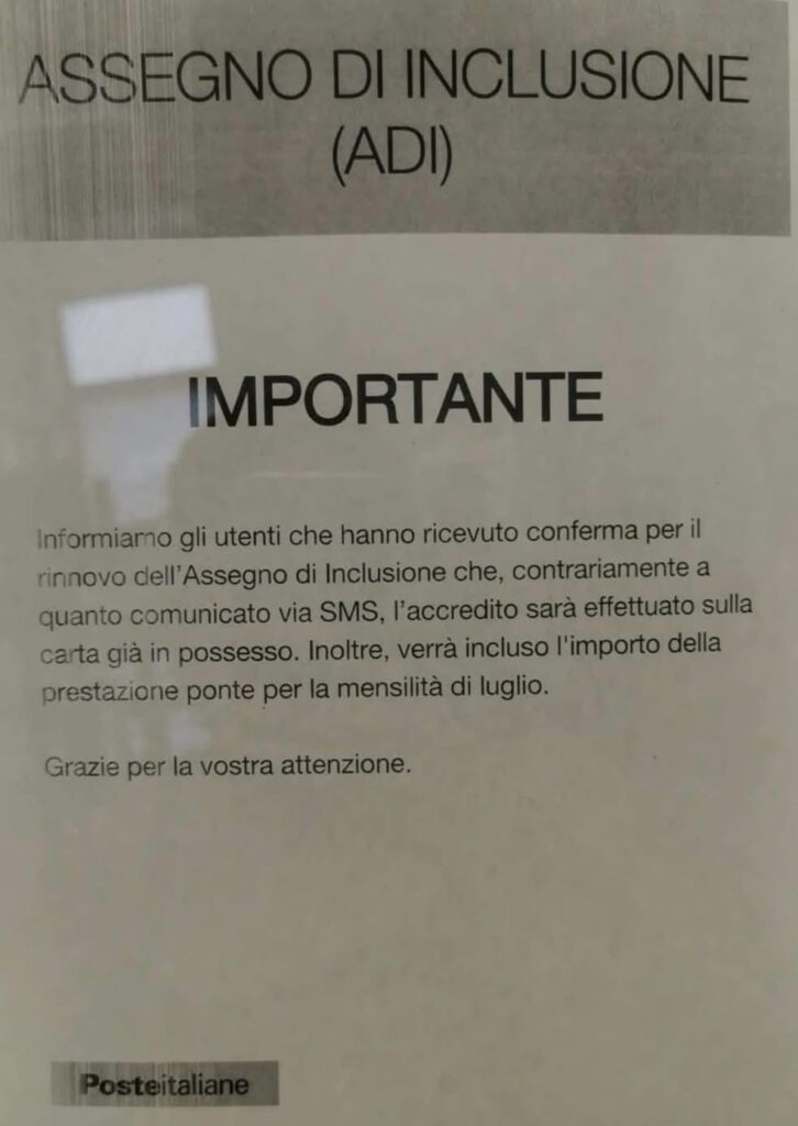 Nonostante la nuova indicazione, in diversi uffici il 14 agosto si è continuato comunque a emettere carte nuove, parliamo ovviamente di coloro che hanno terminato le prime 18 mensilità dell’ADI e avevano già ricevuto notifica di ritiro. Come in questo caso documentato da una nostra lettrice: