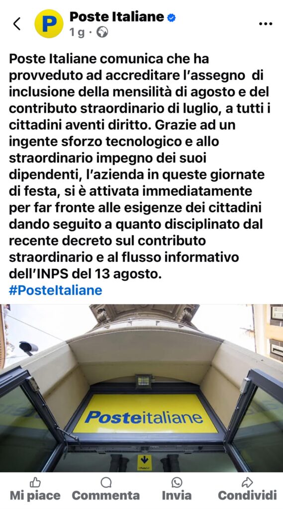 Nel giorno di Ferragosto, Poste Italiane ha diffuso un post su Facebook annunciando di aver accreditato l’assegno di inclusione della mensilità di agosto e il contributo straordinario fino a 500 euro relativo a luglio. Un messaggio trionfale, che lascia intendere che i pagamenti siano arrivati a tutti i beneficiari senza eccezioni. Ma la realtà raccontata dai cittadini è ben diversa: migliaia di persone, pur avendo avuto un esito positivo da parte dell’INPS, non hanno ancora ricevuto nulla.