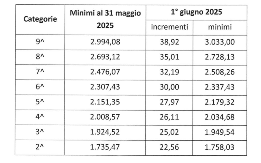 Segue la tabella con gli aumenti retributivi stabiliti dall’accordo Confimi-Fim Cisl il 14 luglio 2025: