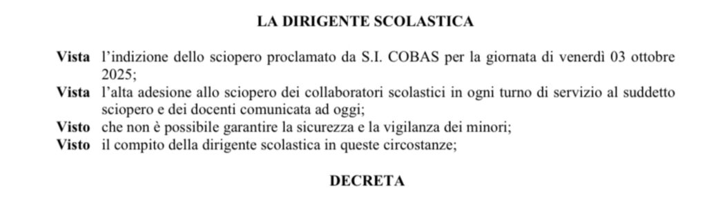 La decisione nasce dall’alta adesione del personale scolastico — docenti e collaboratori ATA — che in diversi casi rende impossibile garantire la regolare apertura dei plessi e lo svolgimento delle attività didattiche. Le comunicazioni stanno arrivando ai genitori tramite registro elettronico, circolari interne e canali istituzionali.