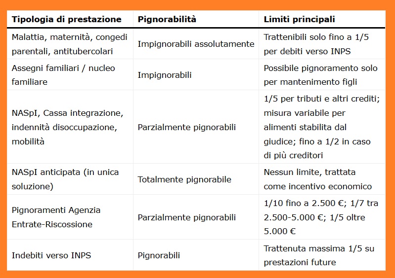 In altre parole, stabilisce fino a che punto creditori e Stato possono trattenere somme da questi trattamenti, e in quali casi, invece, il reddito resta protetto per garantire la sopravvivenza dignitosa del lavoratore.