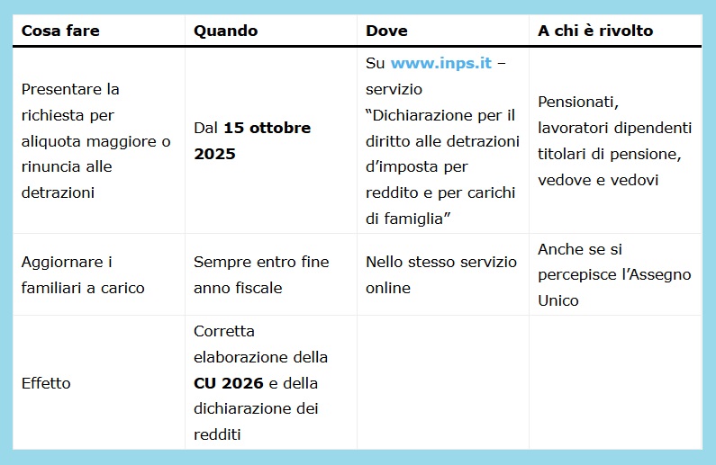A partire dal 15 ottobre 2025, i pensionati e i lavoratori dipendenti che percepiscono prestazioni INPS possono presentare la richiesta per l’applicazione della maggiore aliquota IRPEF o per la rinuncia alle detrazioni d’imposta relative all’anno fiscale 2026.