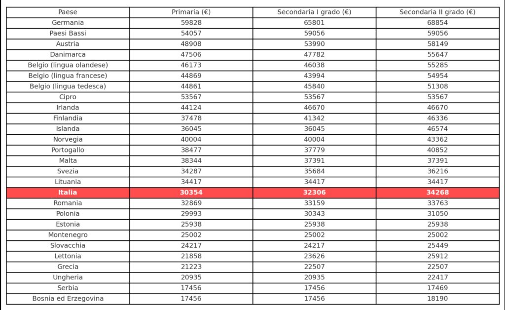 Il confronto con i Paesi più avanzati è impietoso: un insegnante tedesco guadagna più del doppio di un collega italiano, e anche in Olanda, Austria o Danimarca i compensi sono superiori di oltre 20.000 euro l’anno.