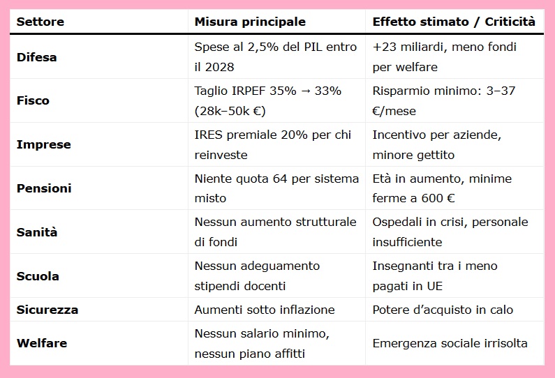 Il governo punta al rigore dei conti e agli impegni europei, ma destina 23 miliardi di euro in più alla difesa entro il 2028, lasciando poco spazio per pensioni, stipendi e welfare.