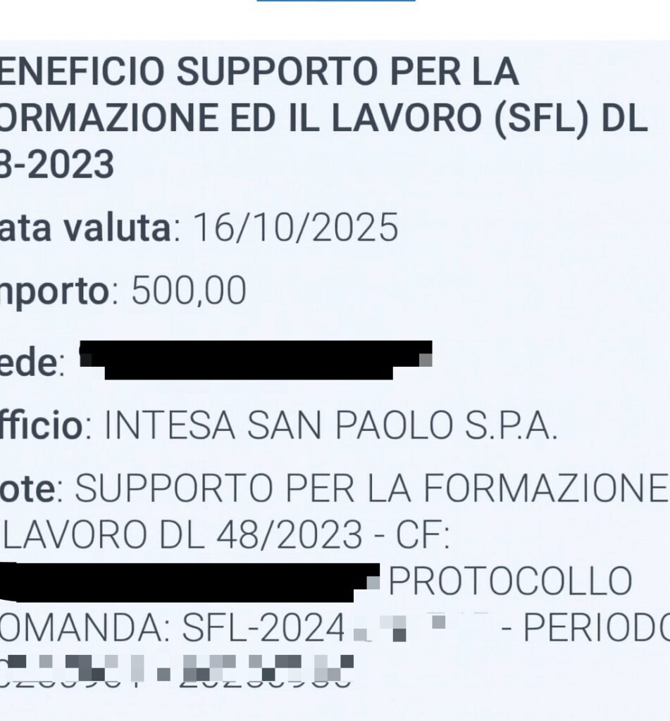 Per chi ha scelto l’accredito su conto corrente, la banca mostra la voce “Supporto per la Formazione e il Lavoro DL 48/2023”. Ecco le informazioni visualizzate in queste ore dai beneficiari: