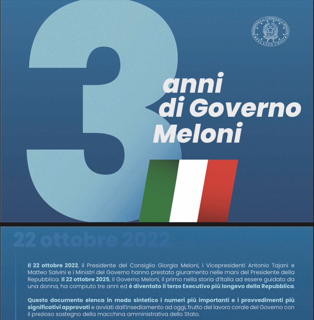 Il 22 ottobre 2025 il Governo guidato da Giorgia Meloni ha raggiunto il traguardo dei tre anni di mandato, diventando il terzo più longevo della Repubblica e il primo guidato da una donna.