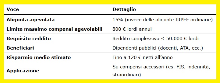 La detassazione consiste nell’applicare un’imposta sostitutiva agevolata del 15% — invece delle aliquote IRPEF ordinarie — su una parte del salario accessorio, cioè su compensi legati a indennità, straordinari, turni o al Fondo per il Miglioramento dell’Offerta Formativa (FIS).