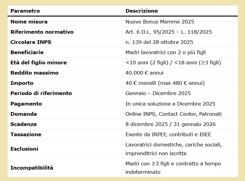 Tabella riassuntiva: requisiti e dettagli del Bonus Mamme