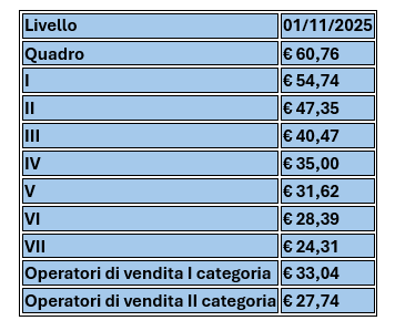 Secondo le tabelle economiche previste dagli accordi firmati nel 2024, gli aumenti decorrono dal 1° novembre 2025 e variano in base al livello di inquadramento. I lavoratori inquadrati come “Quadro” riceveranno 60,76 euro in più al mese, mentre per il I livello l’aumento sarà di 54,74 euro.