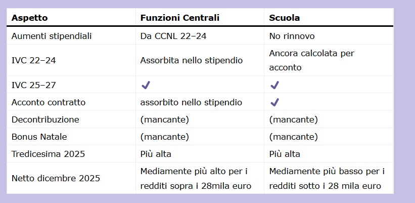 La risposta non è immediata e richiede due analisi distinte: una per il personale delle Funzioni Centrali e una per il personale della Scuola. In entrambi i casi, infatti, la struttura della busta paga 2025 è cambiata: si registrano voci aggiunte, voci eliminate, assorbimenti, e soprattutto l’assenza della decontribuzione 5–6%, che nel 2024 aumentava lo stipendio netto.