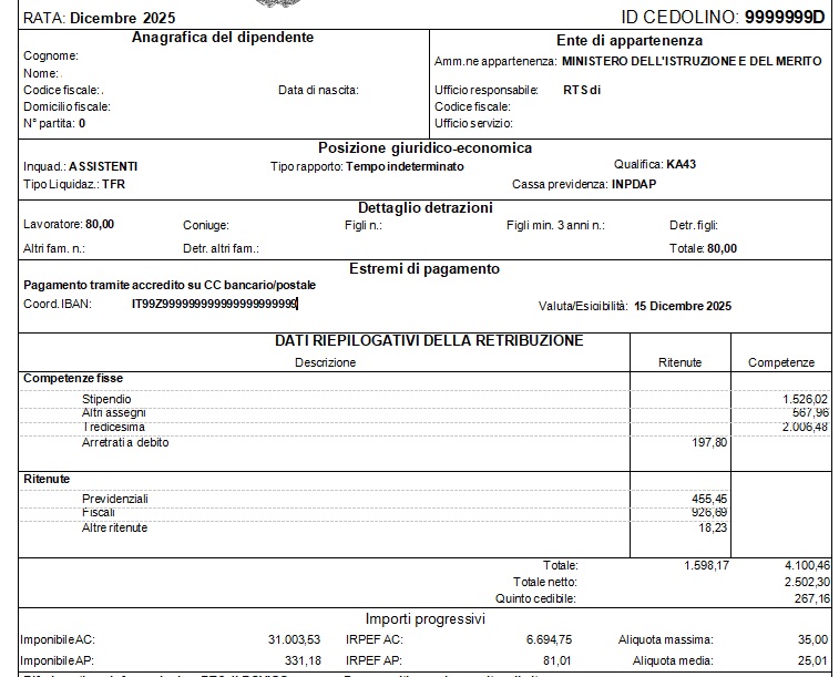 Ed ecco come si presenta invece il cedolino di dicembre di un’assistente amministrativa: