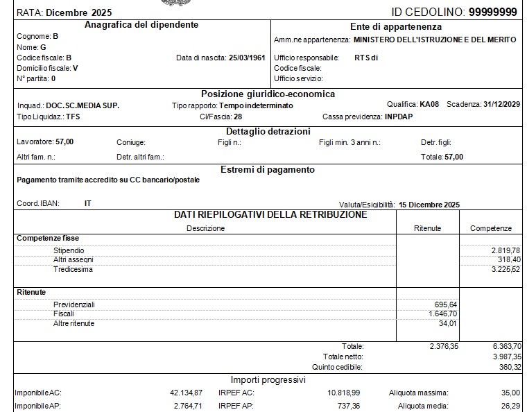 - eventuali rimborsi o recuperi IRPEF legati al conguaglio li si vedrà, di regola, nel cedolino di febbraio.