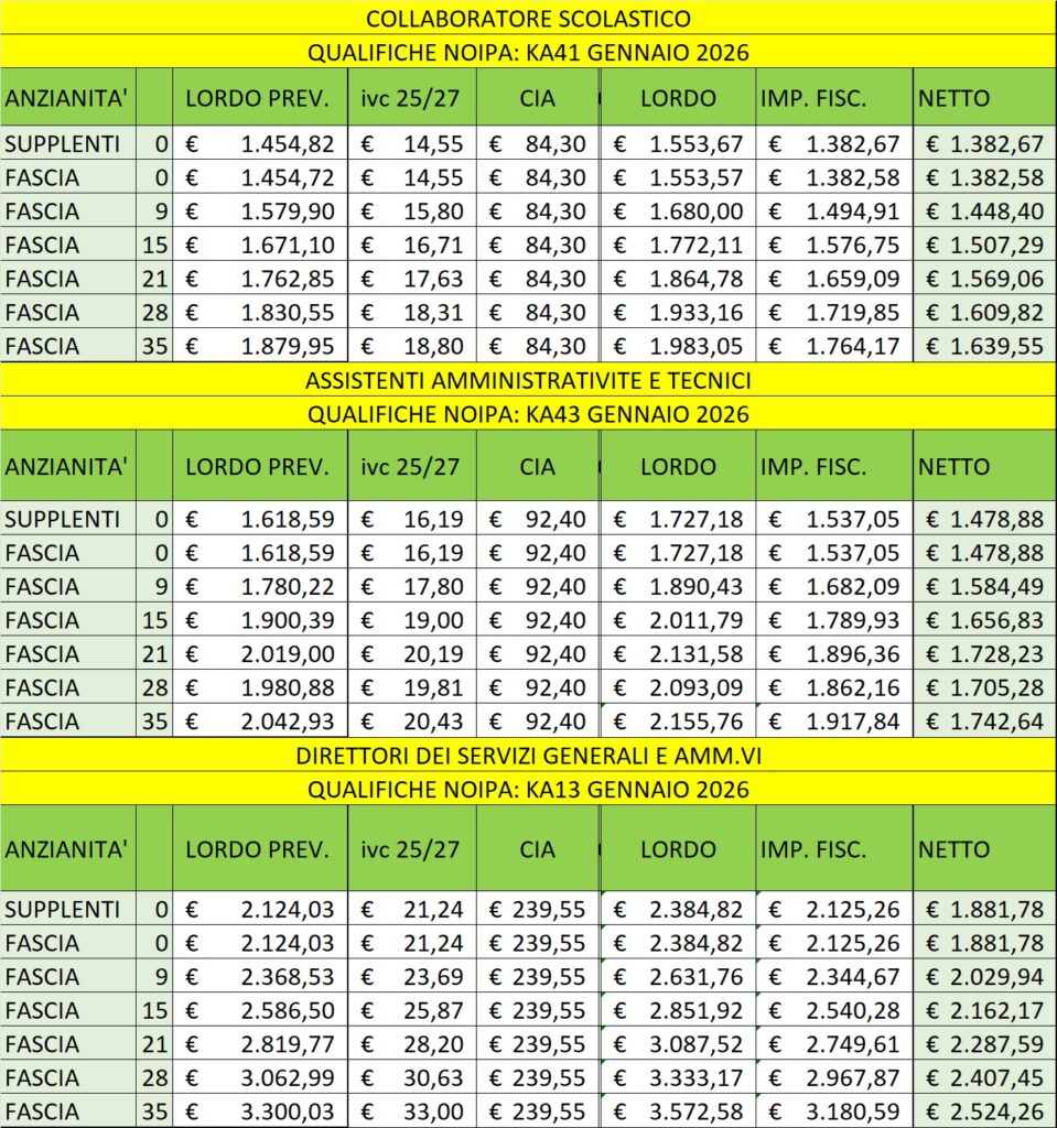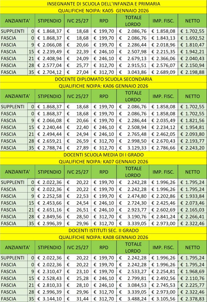 Ecco i nuovi stipendi tabellari di Gennaio 2026 per docenti e ATA, differenziato in base alle fasce di anzianità: