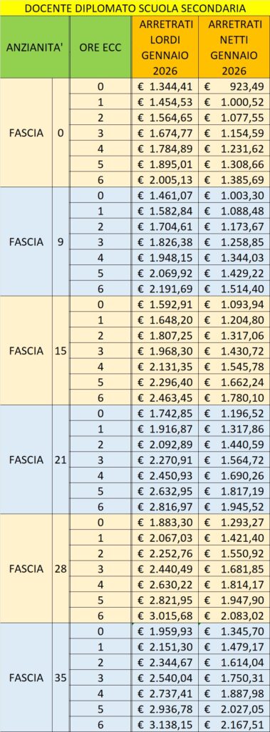 Ecco la tabella degli arretrati per docenti diplomati, docenti di scuola secondaria di I e II grado. Gli importi degli arretrati sono comprensivi degli aumenti contrattuali e delle ore eccedenti: