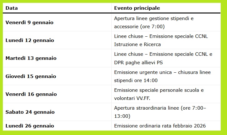 - Giovedì 15 gennaio 2026: emissione urgente unica, con chiusura delle linee “Gestione stipendi” alle ore 14:00.