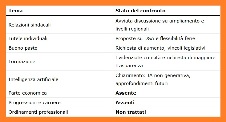 Si tratta di una fase ancora esplorativa: non sono stati presentati testi definitivi, né tantomeno proposte economiche. Tuttavia, l’impostazione scelta evidenzia la volontà di partire dalle regole del gioco prima di entrare nel merito di stipendi, progressioni e istituti contrattuali più attesi dal personale.