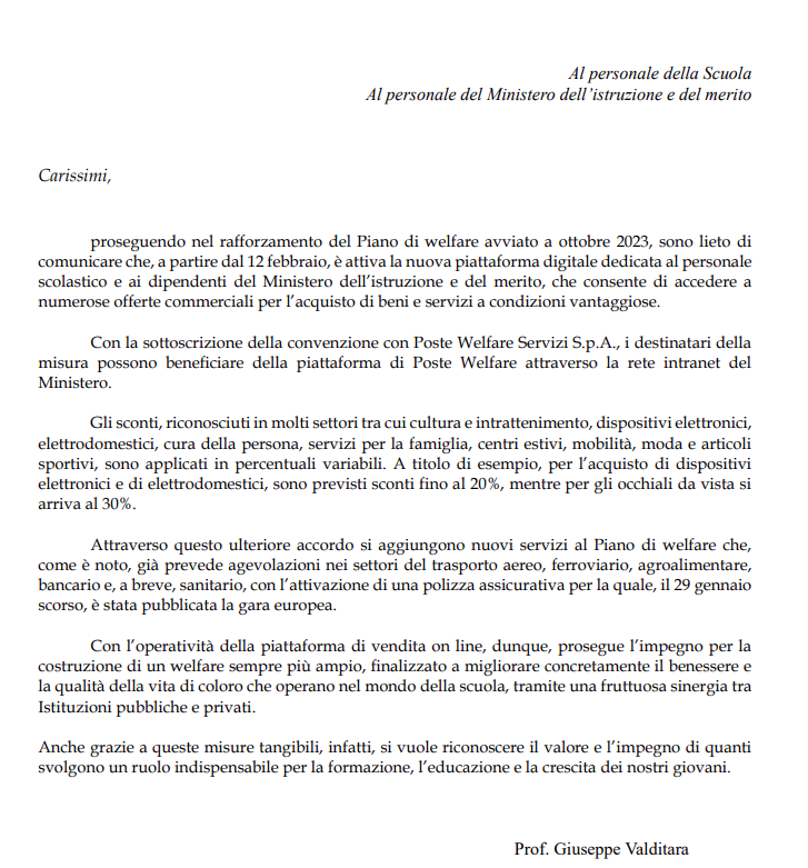 Dal 12 febbraio è attiva la nuova piattaforma digitale di welfare dedicata al personale scolastico e ai dipendenti del Ministero dell’Istruzione e del Merito. L’iniziativa rientra nel rafforzamento del Piano di welfare avviato nell’ottobre 2023 e punta ad ampliare le opportunità di accesso a beni e servizi a condizioni agevolate. Nella giornata di lunedì 16 febbraio il Ministro ha inviato una lettera indirizzata a tutto il personale della scuola per illustrare contenuti e finalità della misura.