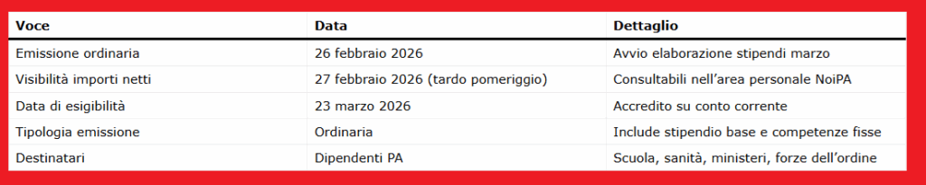 La data di esigibilità, cioè il giorno in cui lo stipendio sarà effettivamente disponibile sul conto corrente, è fissata per lunedì 23 marzo 2026.