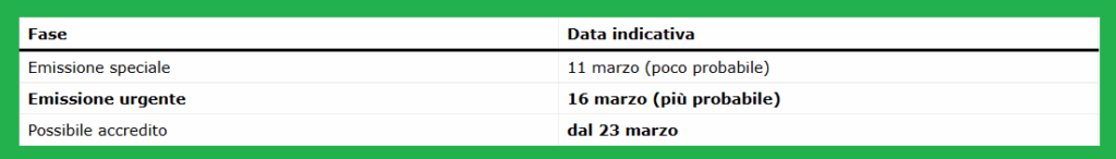 È difficile che il pagamento arrivi con l’emissione speciale dell’11 marzo, mentre appare più probabile l’inserimento nell’emissione urgente prevista per il 16 marzo.