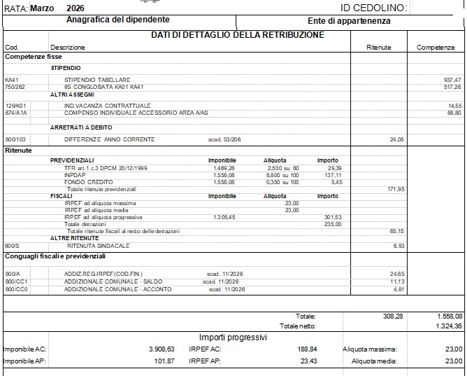 Analizzando la struttura del cedolino di marzo, emergono le principali voci che compongono la retribuzione mensile.