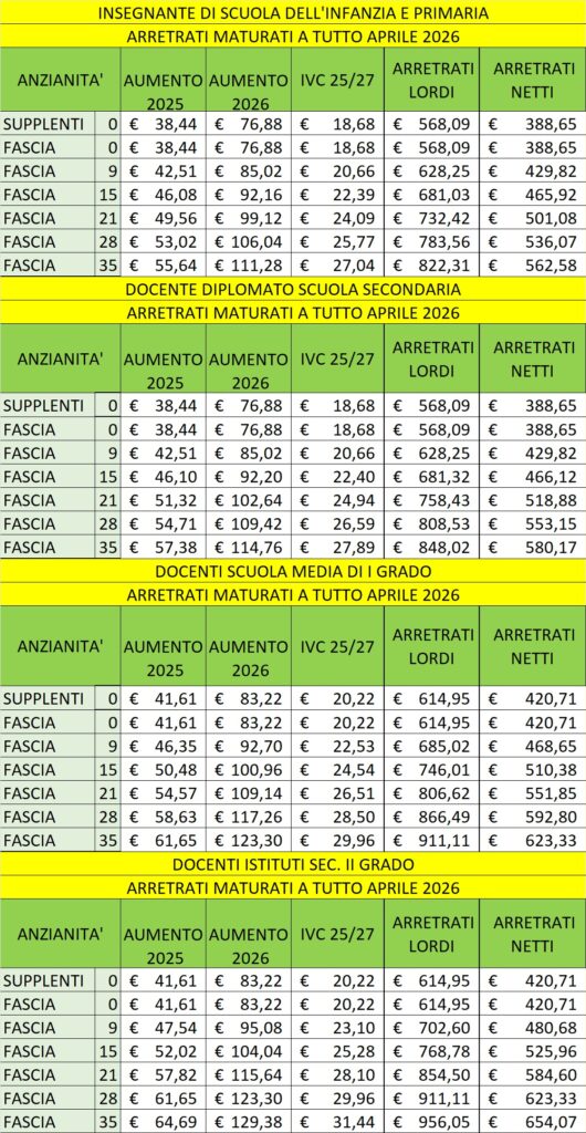 Le cifre riguardano il periodo che va dal 2025 fino ad aprile 2026 e mostrano differenze significative tra gradi di scuola e fasce stipendiali.