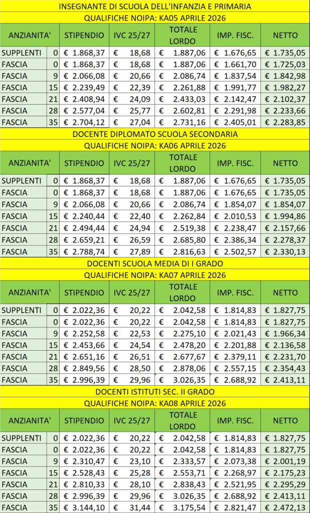 Ecco in tabella come saranno gli stipendi di docenti per il mese di aprile 2026 con l’effetto detassazione accessori: