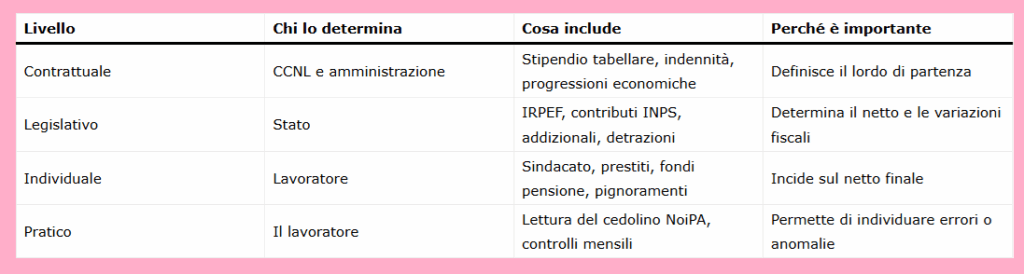 Nel settore pubblico il meccanismo è, almeno sulla carta, più lineare rispetto al privato. Eppure proprio questa apparente semplicità può trarre in inganno. Per orientarsi davvero, può essere utile leggere il cedolino su tre livelli: contrattuale, legislativo e individuale. A questi se ne può aggiungere un quarto, più concreto: quello della lettura pratica.